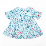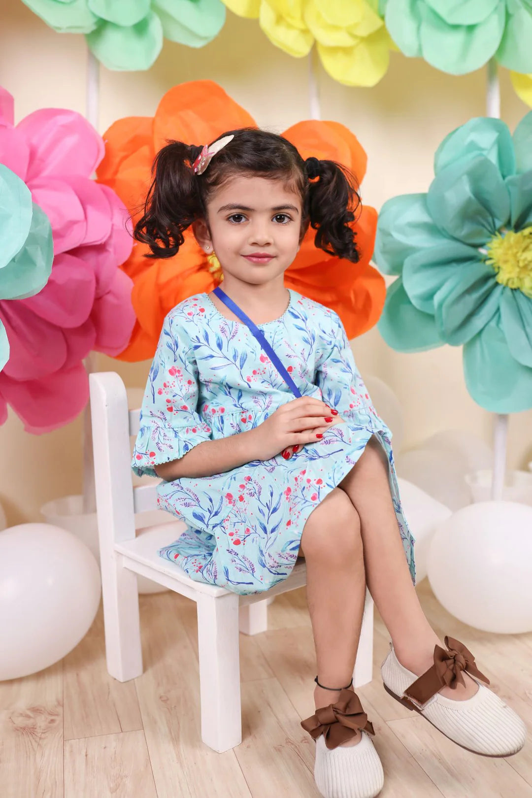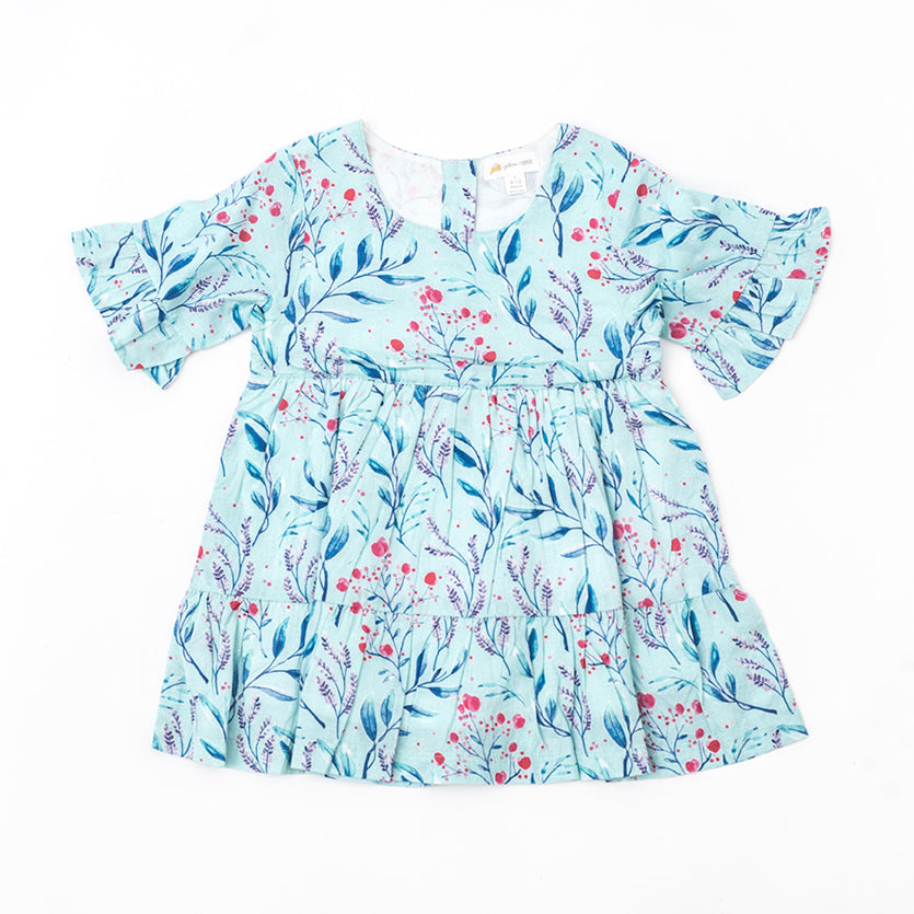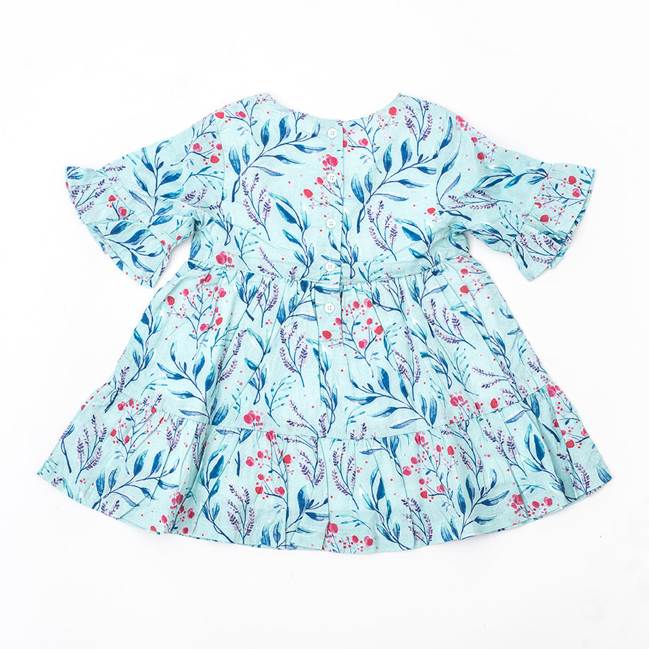 Celeste Blue cambric dress with wild berries and blue ferns print with just about all shades of blue for girls.