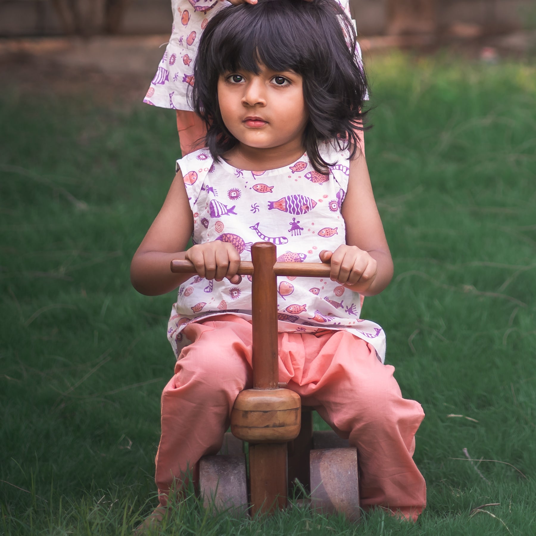 1 x jhabla top: 100% organic cotton sleeveless top with envelope neck for hassle-free wearing. All-over handblock printed fishes in shades of cool mint. 1 x pants: 100% organic cotton mint pants dyed with GOTS certified azo-free colours. Elasticated waistband and bottom hem. Sizes 2 years and above have side pockets and adjustable waist strings.